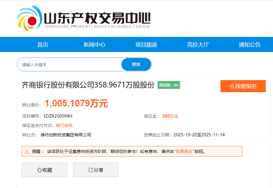 10月17日,山东产权交易中心发布公告显示,潍坊市奎文区国有资本运营中心下属的潍坊创新投资集团有限公司(简称“潍坊创投”)将所持齐商银行股份有限公司(简称“齐商银行”)358.9671万股股份公开转让,转让底价1005.1万元。